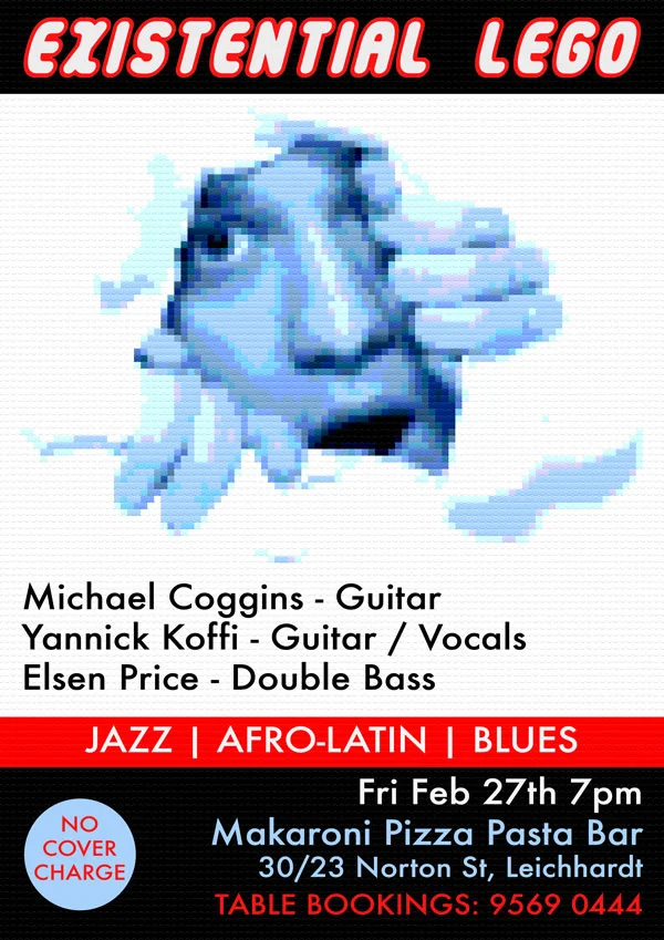 Existential Lego at Makaroni Pizza & Pasta Bar Friday, February 27, 2015 7:00 PM 10:00 PM 19:00 22:00 Makaroni Pizza & Pasta Bar 21-23 Norton St Leichhardt, NSW, 2040 Australia (map) Google Calendar ICS